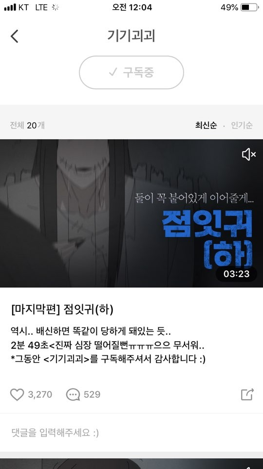 웹툰 「기기괴괴」가 플레이툰으로서 독자에게 소구하는 점도 바로 이 ‘공포’에 있다. 이는 8년 전 네이버가 히트시켰던 「봉천동 귀신」이 향유자를 사로잡은 것과 비슷한 이유일 테다. 그러나 2019년의 「기기괴괴」는 2011년의 「봉천동 귀신」보다 확실히 진일보했다.