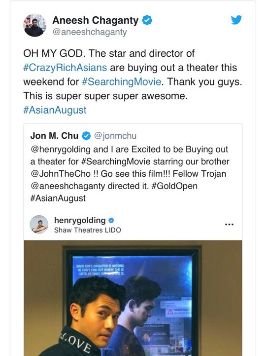 <서치>의 또 다른 관람 포인트는 데이비드의 가족들이 모두 한국계 미국인이라는 점이다. 그동안 한국계 미국인이 주연을 맡은 영화가 몇 작품이나 될까. 이 가운데 할리우드에서 아시아계 미국인이라는 스테레오타입을 비껴가는 역할들만 고르는 존 조를 보면 현명하다는 생각이 절로 든다. 아니쉬 차간티 감독은 “왜 주인공을 한국계 가족으로 설정했는가?”라는 질문에 대해 “이 이야기를 생각할 때부터 존 조와 함께 하고 싶었다”며 “존이 주인공이기 때문에 당연히 한국인이 중심일 수밖에 없다”고 전했다. 최근 아시아계 배우들로만 구성된 영화 <크레이지 리치 아시안스>의 개봉에 맞춰 아시아인들이 전폭적인 지지를 보여 화제가 된 적이 있다. 에릭남이 미국 애틀랜타의 한 극장 전체 표를 구매했다는 훈훈한 이야기를 들었는데, 받은 대로 돌려주려는지 <크레이지 리치 아시안스> 감독인 존 추와 주연배우 헨리 골딩은 <서치> 개봉에 맞춰 한 극장의 표를 구매했다고 인증했다.