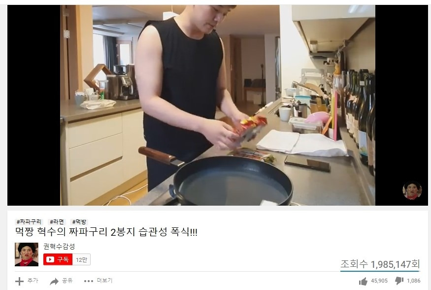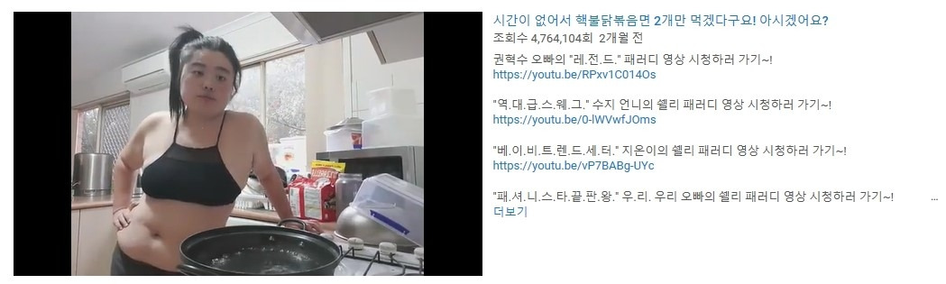 이 글을 쓰는 2019년 6월 12일 현재, 유튜버 구도 쉘리의 구독자는 27만 명이다. 검은색 브라탑에 질끈 묶은 머리, 스트레스성 폭식으로 출근 전 핵불닭볶음면 2개를 먹는 구도 쉘리는 이 영상 하나로 수많은 패러디를 양산하며 그야말로 빵 떴다.