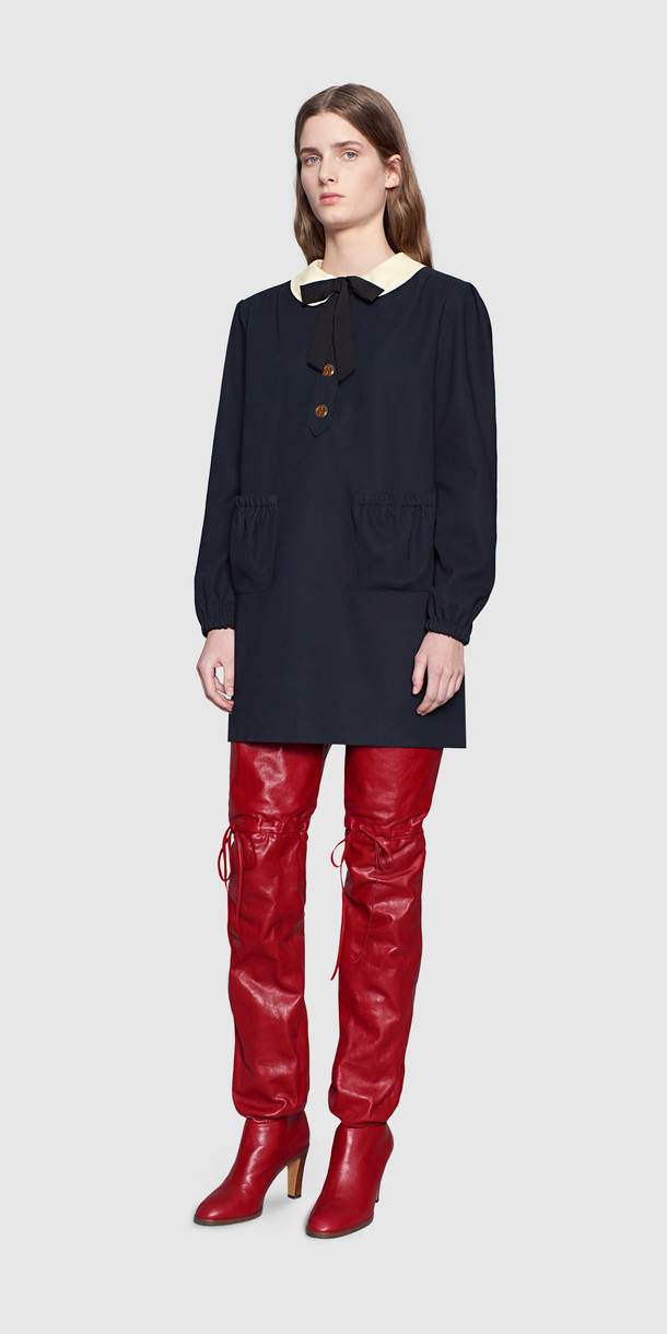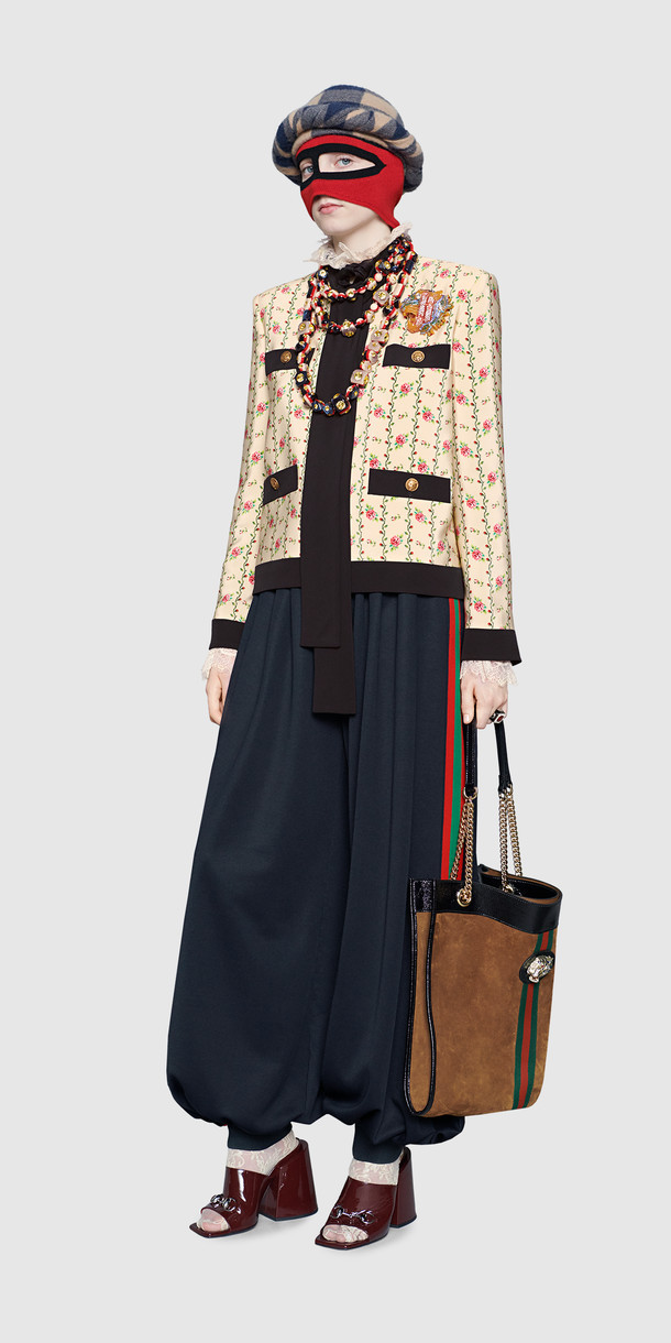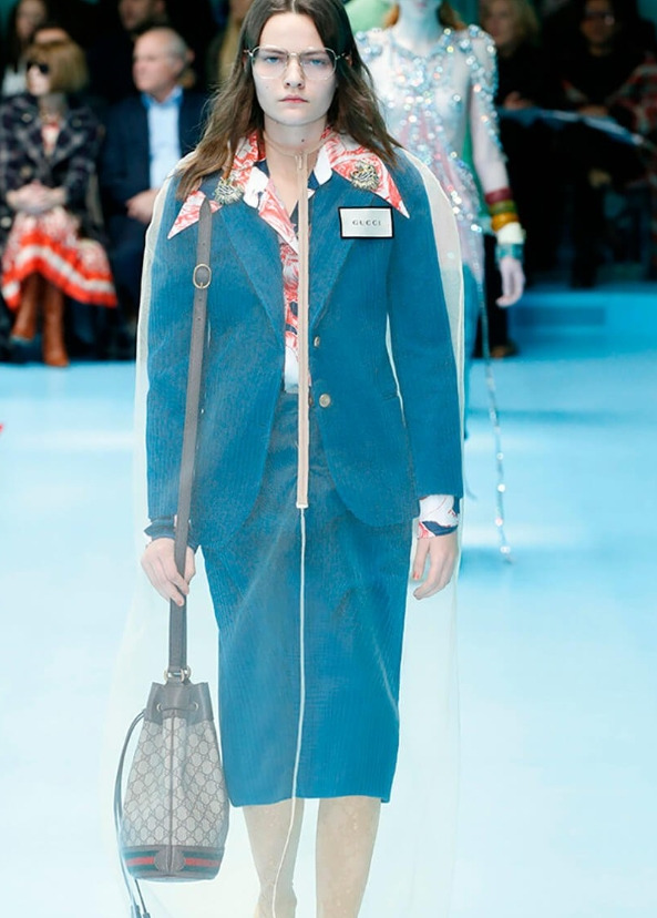 컬렉션을 보니 2015년 알렉산드로 미켈레를 크리에이티브 디렉터로 영입한 뒤 달라진 구찌의 면면이 잘 드러났다. 우리는 그저 미켈레가 화려한 꽃무늬나 동식물 모티프 자수, 장식을 활용한 대담한 디자인으로 무장했다고 생각한다. 이러한 화려함이 기존의 고루했던 구찌 이미지를 깨부수었다고 말이다.