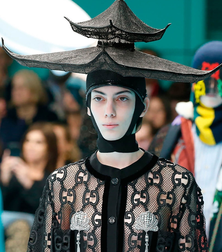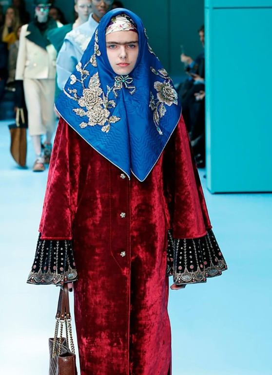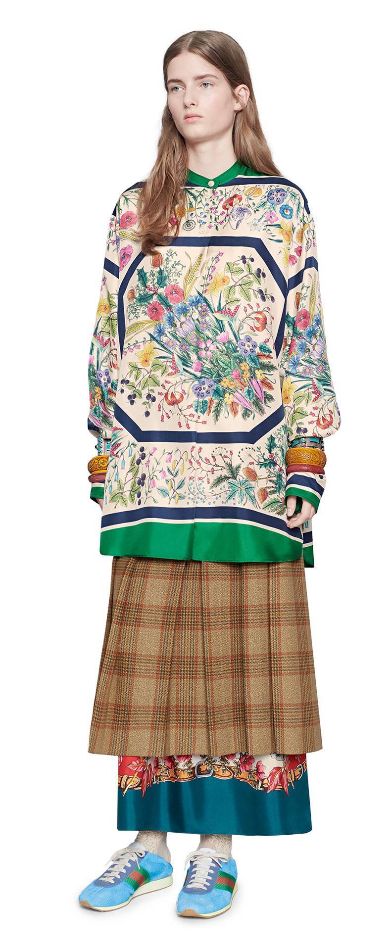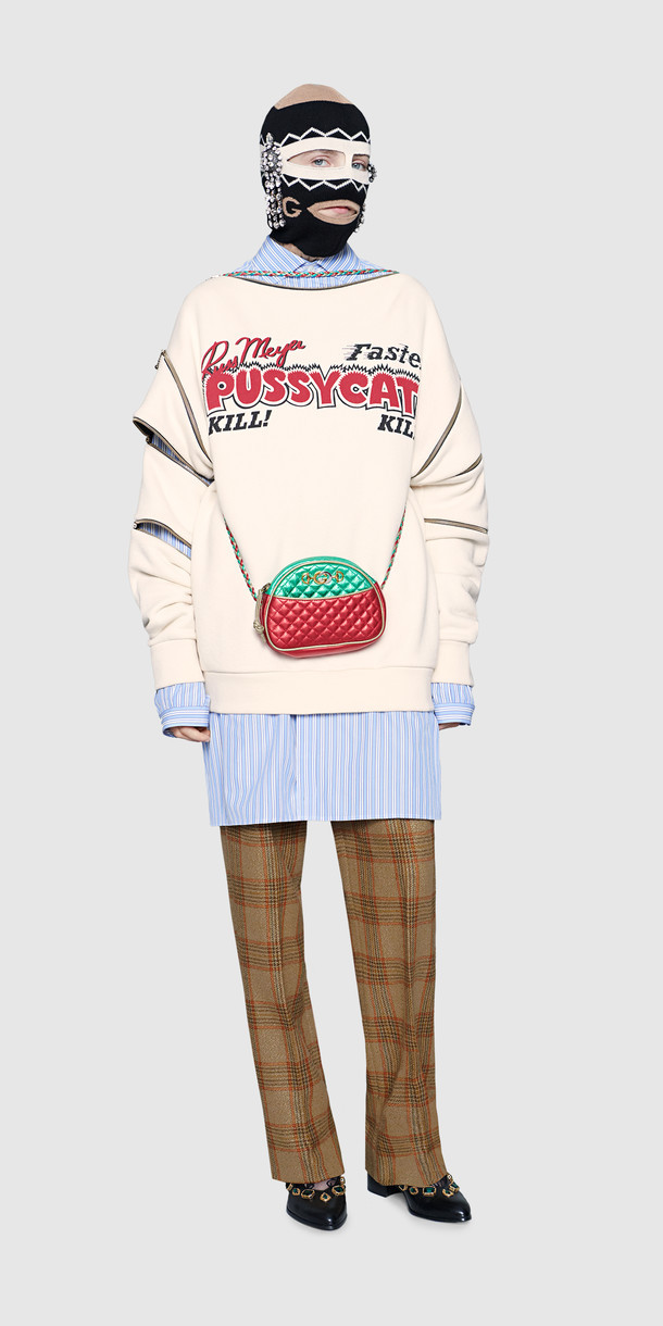 이번 FW쇼는 도나 해러웨이의 『사이보그 선언 』에서 영감을 받았다고 한다(국내에선 올해 12월 책세상 출판사에서 발간 예정이다). 도나 해러웨이는 과학과 철학, 페미니즘을 바탕으로 남성 대 여성, 자연 대 문화 등 무수한 이분법적 사유의 경계를 허물고자 하는, 독창적 사상가다. 『사이보그 선언』은 스타워즈와 신냉전의 시대였던 20세기 후반을 사회주의 페미니즘의 관점에서 분석하면서 여성을 인간과 동물과 기계와의 융합으로 이루어진 사이보그로 코드화한 글이다. 이 책에서 영감을 받았다는 2018 구찌 FW쇼에서는 러시아의 바부시카, 중국 잠옷, 스코틀렌드 체크와 영국의 트위드 등이 혼재돼 있었다.