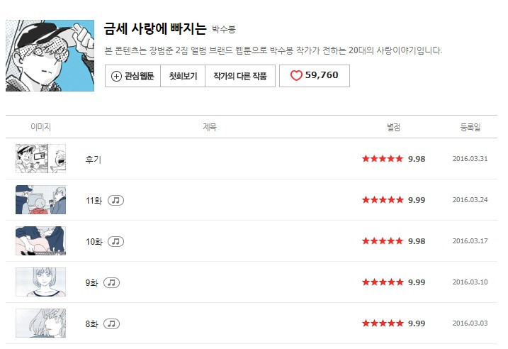 감성적인 음악과 웹툰이 정서적으로 조화를 이루며 현실에서 있을 법한 사랑 이야기를 통해 폭넓은 공감을 자아낸다. 마치 펜으로 슥슥 그린 듯한 그림체 속에는 향유자들 개인의 사랑 이야기와 유사한 스토리가 있기 때문에 아련했던 첫사랑과 그 후의 연애를 떠올리며 <금세 사랑에 빠지는>의 이야기에 푹 빠지게 된다. 또한 각자의 사랑을 노랑, 분홍 등의 컬러로 포인트를 주며 표현한 것도 향유자들의 심금을 울린다. 잘 만들어진 브랜드 웹툰은 열 마케팅 전략 부럽지 않다. 브랜드 웹툰이 우리 출판계에 시사하는 바가 분명히 있을 것이다.