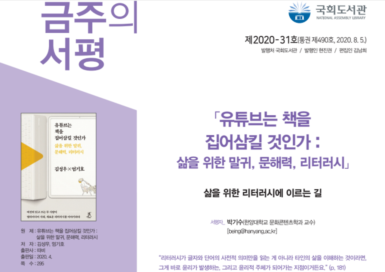 - 박기수 한양대학교 문화콘텐츠학과 교수, ‘삶을 위한 리터러시에 이르는 길’ 「유튜브는 책을 집어삼킬 것인가 : 삶을 위한 말귀, 문해력, 리터러시」 , 국회도서관 <금주의 서평> 제2020-31호(통권 제490호, 2020. 8. 5.)