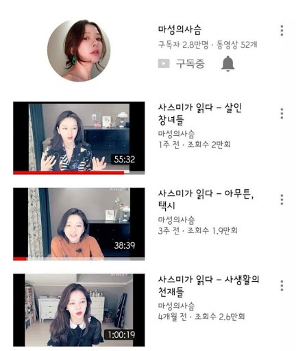 책에 대한 이야기를 보고 듣는 것이기에 책에 대한 이야기를 정갈하게 풀어놓는 크리에이터들의 보이스도 향유자들의 귀를 사로잡는 데에 주효하게 작용한다. 북튜버 김사슴은 ‘SASUMI김사슴’이라는 채널을 운영한다. 구독자 수는 2.94만 명이다. 아프리카tv BJ로 유명했던 김사슴은 아프리카 방송 중에 진행했던 코너 ‘사스미가 읽다’ 채널을 유튜브로 가져왔다. 중간에 휴지기를 한번 거치고 2020년 7월 11일부터 다시 동영상이 업로드되고 있다. 북튜버 김사슴이 읽은 책에 대한 소개와 해당 도서의 낭독이 주요 콘텐츠라 힘있으면서도 부드러운 김사슴의 보이스가 향유자에게 킬링 포인트로 작용한다.