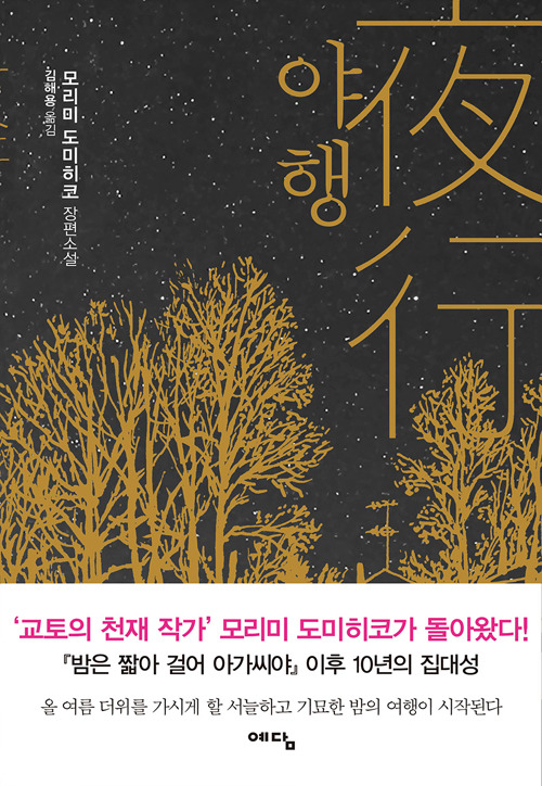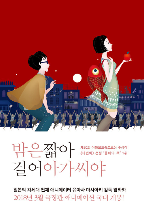 사실 대학생 때 원작자 모리미 토미히코의 『밤은 짧아 걸어 아가씨야』를 흥미롭게 읽었고, 다 읽지는 못했지만 『야행』도 가지고 있습니다. 무라카미 하루키가 유방에 집착한다면 모리미 토미히코는 검은 머리에 집착하죠. 『밤은 짧아 걸어 아가씨야』에는 그런 모리미 토미히코의 판타지가 극대화된 ‘검은 머리 귀여운 후배 아가씨’가 등장합니다. 주인공은 그녀를 짝사랑하는 어수룩한 선배 남학생이고요. 출판사가 제공한 책소개에도 이렇게 써 있습니다.