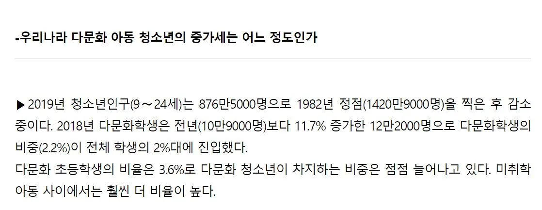 이주민 2세, 다문화 가정에 대한 차별은 제주에서만 일어나는 일이 아니다. 우리나라 전반적으로 일어나고 있는 현상이며 다문화 가정에 대한 차별과 정부 정책의 사각으로 인해 마땅한 권리를 누리지 못하고 있는 것이 사실이다.