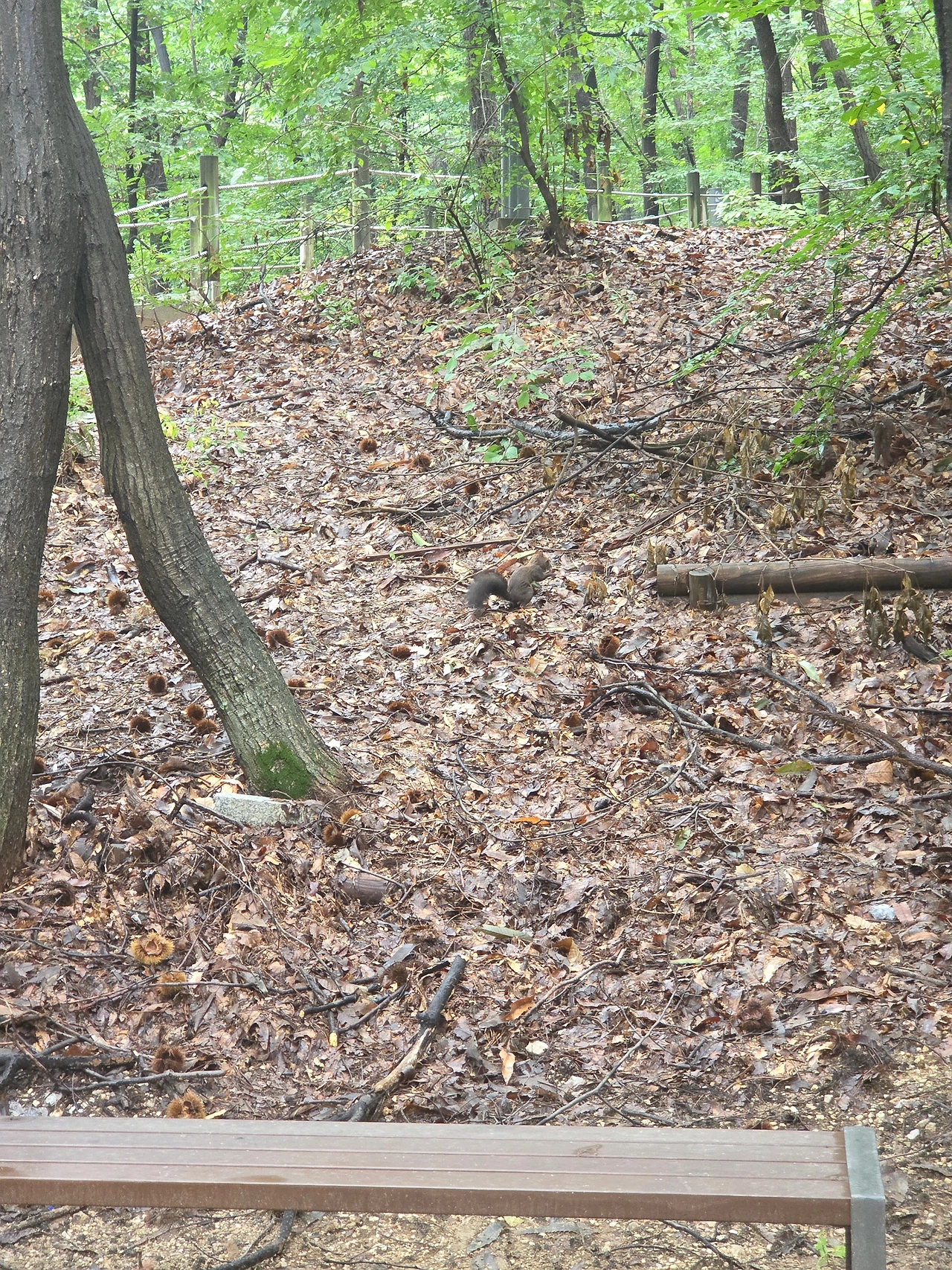나는 다시 숲이 내뿜은 피톤치드를 한껏 들이키며 한참을 걸어 올랐다. 이번엔 더 높은 곳에서 '사사삭 서억서억' 심상치 않은 소리가 났다. 고개를 꺾어 올려다보니. 키 큰 나무의 가지 사이를 다람쥐인지 청설모인지 모를, 아까보단 작은 녀석이 바쁘게 옮겨 다녔다. 그러다 툭! 하고 내 발 앞에 작은 밤톨 하나가 떨어졌다.