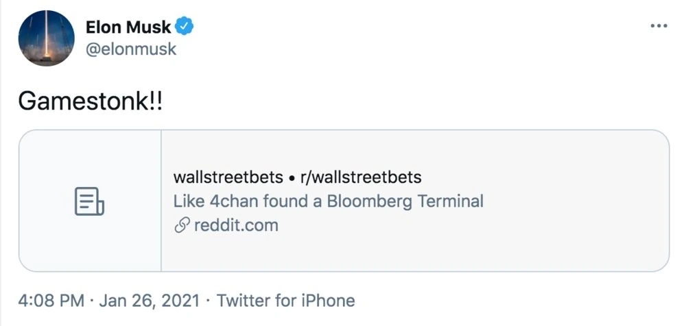 Gamestonk (게임스톱 대폭격)을 이야기하며 해당 레딧 게시글을 태그 했고