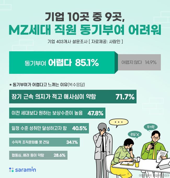 2021년 구인구직 매칭 플랫폼 사람인은 기업 403개사를 대상으로 1980년~2000년생 직원의 동기부여 현황을 조사한 적이 있습니다. 이 조사 결과, “동기부여하기 어렵다”라는 응답이 85.1%로 조사됐다.