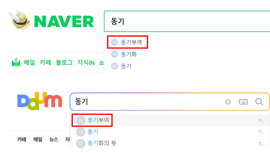 그렇다면, '동기'라는 단어를 검색창에 넣었을 때, 가장 상단에 뜨는 자동완성 Keyword는 뭘까요?