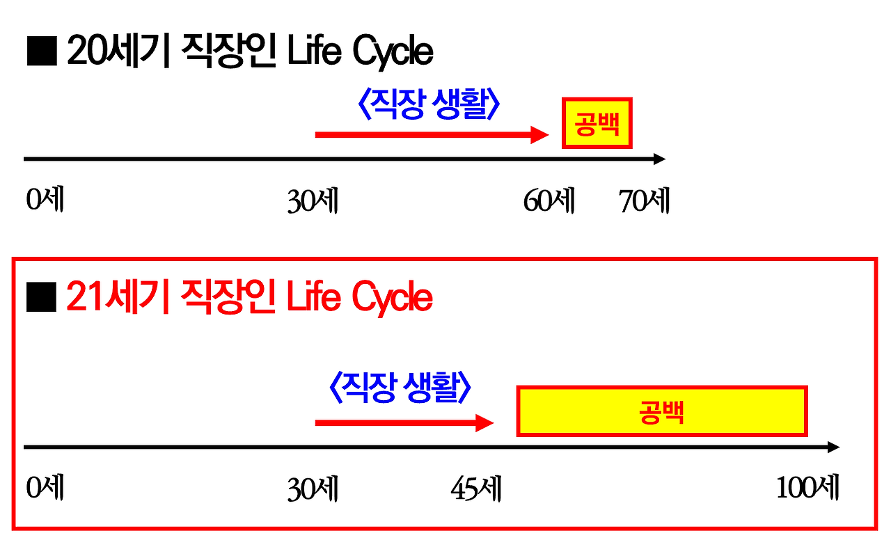 20세기와 21세기의 '직장인의 라이프 사이클'을 단순 비교하자면, 위와 같은 도식이 가능할 것입니다. 정년이란 것이 존재했던 낭만의 (IMF이전) 20세기 대한민국 직장인들은 60세 정년에 은퇴를 한 이후에 삶의 마지막까지의 공백이 지금처럼 그렇게 길지도 않았죠. 하지만 21세기인 지금은 K-직장 생활의 길이는 점차 짧아지고 있고, 100세 장수시대를 맞이하여 공백기는 더 길어지고만 있죠.