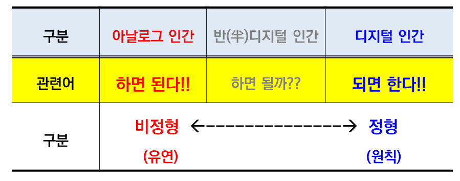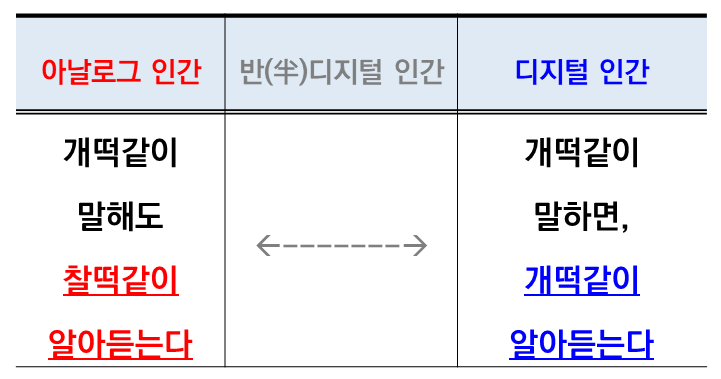 저는 아날로그 인간과 디지털 인간의 특징의 구분을 아래와 같이 진행해 보았습니다.