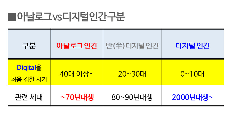 자. 여기까지가 1차적인 구분입니다. 이 1차 구분은 단순히 디지털을 접한 시기에 따른 세대적인 구분이기 때문에 완전한 구분법은 아닙니다. 누군가를 '아날로그적'이나 '디지털적'이냐는 판단하는 것이 단순히 어느 출생연도냐에 따라서 결정되는 않을 것입니다.