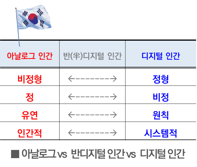 아날로그 인간, 디지털 인간 중에서 어느 인간형이 더 지금의 사회에 맞고 옳은지는 제가 판단하기는 어렵습니다. 하지만 한 가지는 알 수 있습니다. 전통적인 우리 대한민국은 원칙적이면서 가끔은 비정한 오른쪽보다는 왼쪽이 가깝다는 것을요.