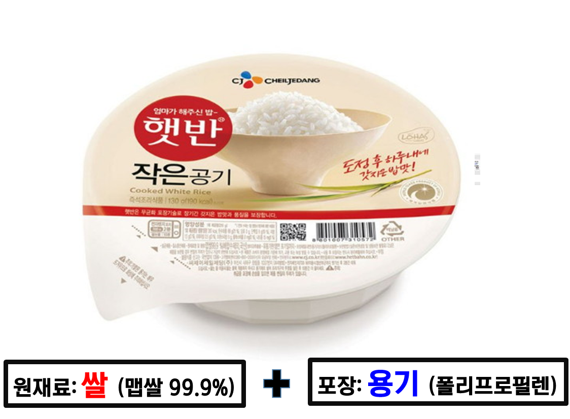 햇반을 한 번 예로 들어볼까요? 햇반을 만들어 내기 위해서 가장 기본적으로 필요한 것은 원재료인 ”쌀“과 용기가 필요합니다.