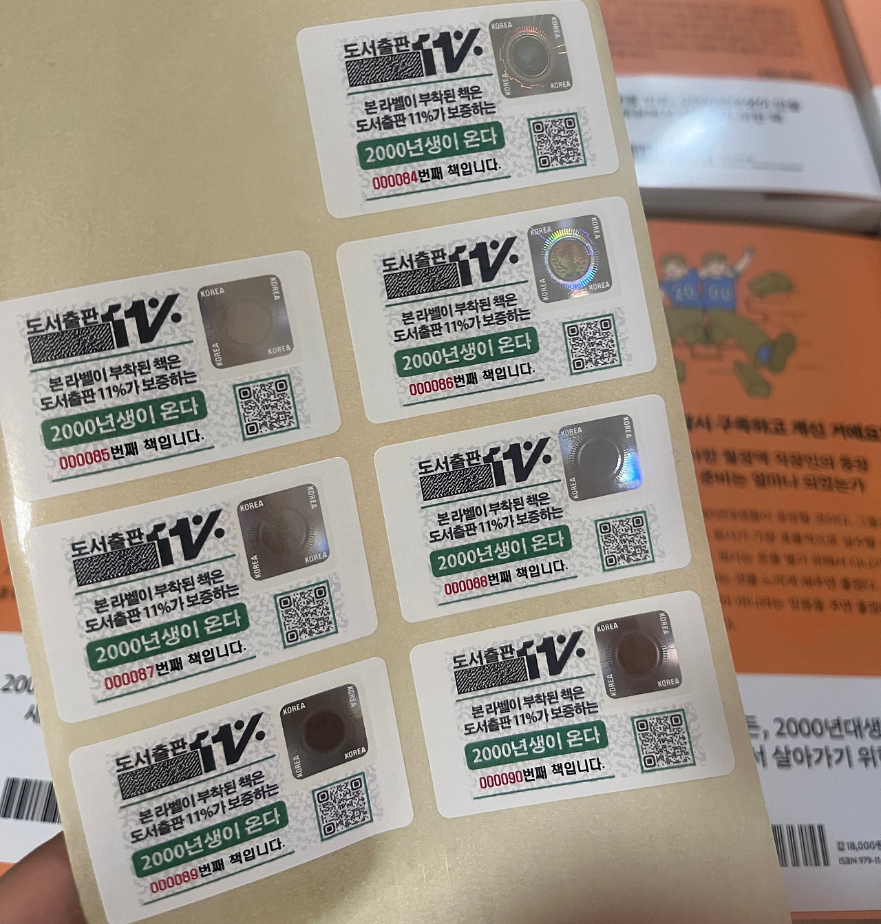 도서출판 11%에서 이번에 출간된 ≪2000년생 온다≫의 모든 책에는 위와 같은 '홀로그램 라벨 스티커'가 붙어있습니다. 이 홀로그램 스티커는 1번째부터 순서대로 단 1개만이 발행되며, 인쇄된 책의 순서대로 붙어서 출고됩니다.