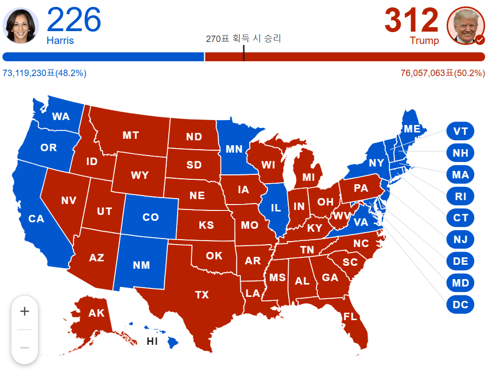 얼마 전에 2024년 미합중국 대통령 선거가 열렸습니다. 개표결과 미국 공화당의 트럼프 후보가 꽤나 큰 선거인수 차이로 제47대 대통령으로 당선이 확정되었네요. (비록 우리나라는 아니지만) 승리한 트럼프 후보에게는 축하의 박수를, 패배한 해리스 후보에게는 심심한 위로를 건넵니다.
