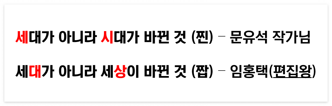 전 단지 나중에 언론 인터뷰나 대담 등에서 이것 명문장을 변형하여, '시대' 대신 '세상'이란 단어를 써서 “바뀐 것은 세대가 아니라 세상이다” 라고 드립을 쳤을 뿐입니다. 말하자면, 저는 짭이고 문유석 작가님이 찐인 셈이죠 : )