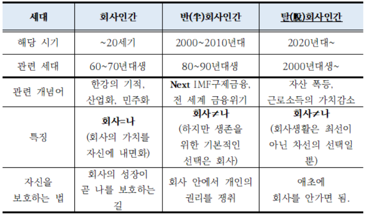 하지만 그렇다고 할지라도 완전히 회사인간에서 벗어난 행태를 보이지도 않죠. 왜냐하면 이들이 커리어를 선택하는 형태는 다양했지만, 대학을 졸업하고 회사 조직에 입성하는 것을 기본 옵션으로 달고 있었기 때문입니다. 2010년도 중후반까지 일었던 공시(공무원시험) 열풍도 결론적으로는 (국가가 고용주인) 회사에 입사하는 구조였죠. 결국 80년대생과 90년대생의 회사인간과 탈회사인간의 중간인 반(半,Half)회사인간 라고 말할 수 있겠습니다.