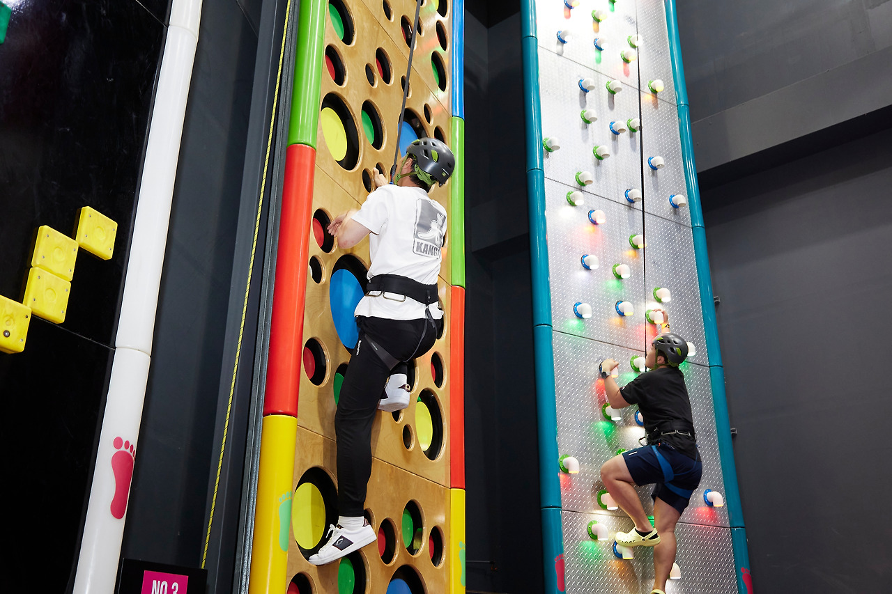 다행히 발권을 마치고 입장에 성공했다. 시설 입장권을 겸한 밴드를 팔목에 두른 뒤, 게이트에 태그하고 마침내 입장하자 온갖 놀거리가 네 사우 앞에 펼쳐졌다. 가장 먼저 체험하기로 한 것은 인도어 아트클라이밍. 하남점 기준 난이도에 따라 5개의 코스를 선택할 수 있다. 잠시 순서를 기다린 뒤 하네스와 안전모부터 착용한다. 안전장비는 각자 체형에 맞는 사이즈를 선택해 착용할 수 있다. 장비 점검을 마치고 시설 옆의 키오스크에 밴드를 태그하면 클라이밍 기록 또한 남길 수 있는 점이 포인트. 먼저 두 사우가 클라이밍에 도전한다.