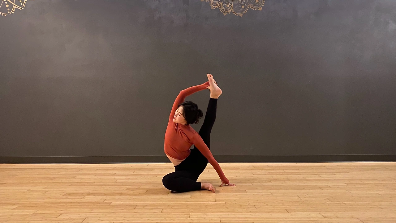 양 팔로 몸 전체를 지탱한 뒤 양다리를 앞 뒤로 찢어 공중에 띄우는 ‘에카파다코운딘야 아사나’