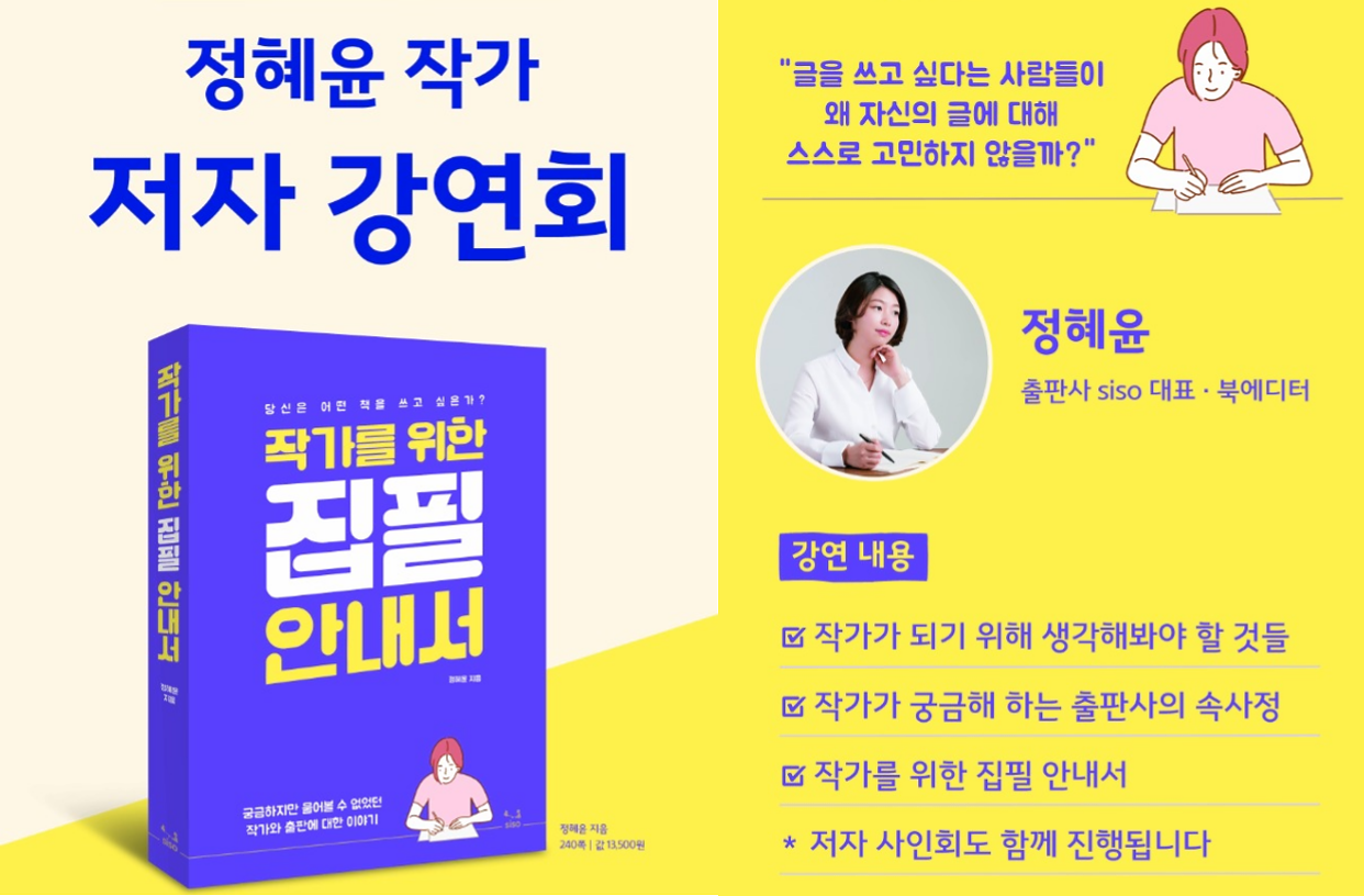 그런 의미에서 이 책이 예비 작가들에게 쓴다는 것의 가치를 다시 한 번 생각하게 하고, 정말 글을 쓰는 사람이 되고 싶다는 마음이 들게 하는 조그만 계기가 되길 바라며 7월 25일 저녁 홍대에서 독자분들과 함께 이야기 나눌 수 있는자리를 준비했습니다.