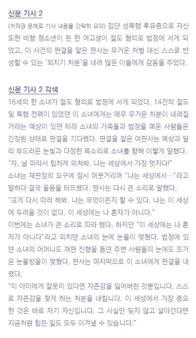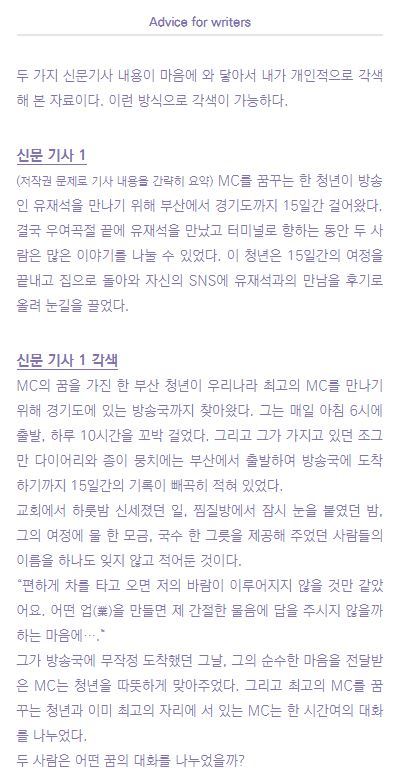 예전에 신문기사를 보다가 스토리 형식으로 각색하면 매력적인 글이 될 것 같아서 뒤 페이지에 예시로 넣어 보았다. 이렇게도 글을 바꿀 수 있다는 것 정도로 참고해 보길 바란다.