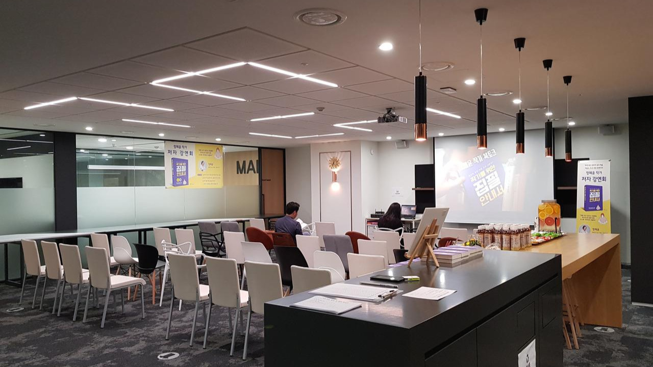 저녁 시간이라 혹시 끼니를 못 챙겨드시고 오실 분들을 위해 간단한 웰컴푸드와 음료, 현장에서 구매하실 수 있도록 도서도 진열해두었습니다 :)
