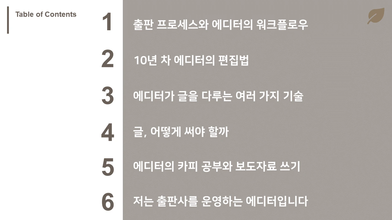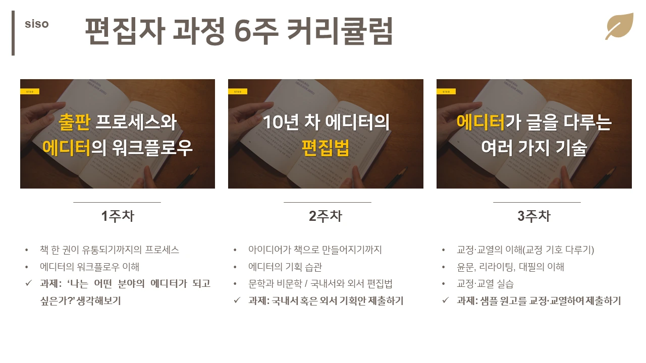 지난 9월부터 진행한 '에디터와 작가를 위한 편집자 과정' 1기 종강을 앞두고 11월 22일 (목) 저녁 신촌에서 총 6주간 진행될 2기를 모집합니다.