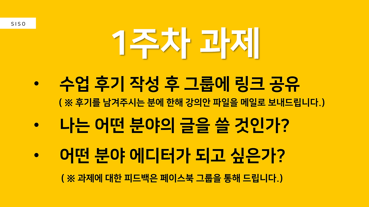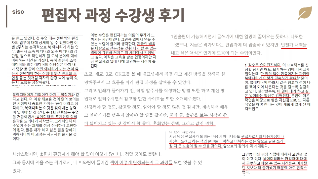 평소 출판 편집자가 어떤 일을 하는지 관심있거나 예비 편집자를 꿈꾸고 있으신 분, 출판사 SISO 편집실이 어떻게 운영되는지 알고 싶은 작가님들 모두 편하게 영상을 시청하실 수 있습니다. 더불어 이미 수강하셨던 편집자님들은 한번 더 리마인드 할 수 있는 시간이 될 것 같습니다.