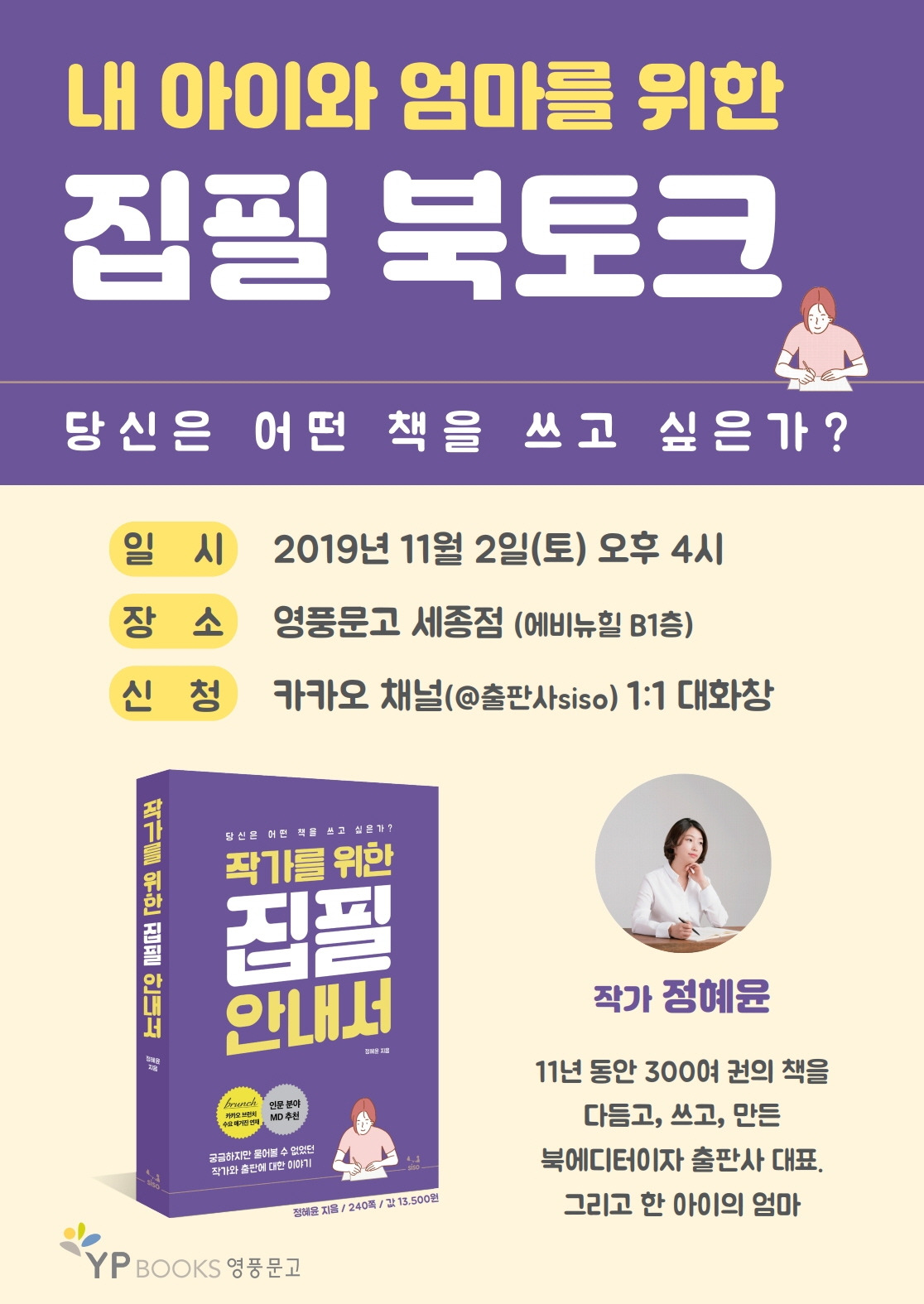 영풍문고 세종점에서 《작가를 위한 집필 안내서》 저자 정혜윤 저자 강연회-'내 아이와 엄마를 위한 집필 북토크가 세종시에서 진행됩니다 :)