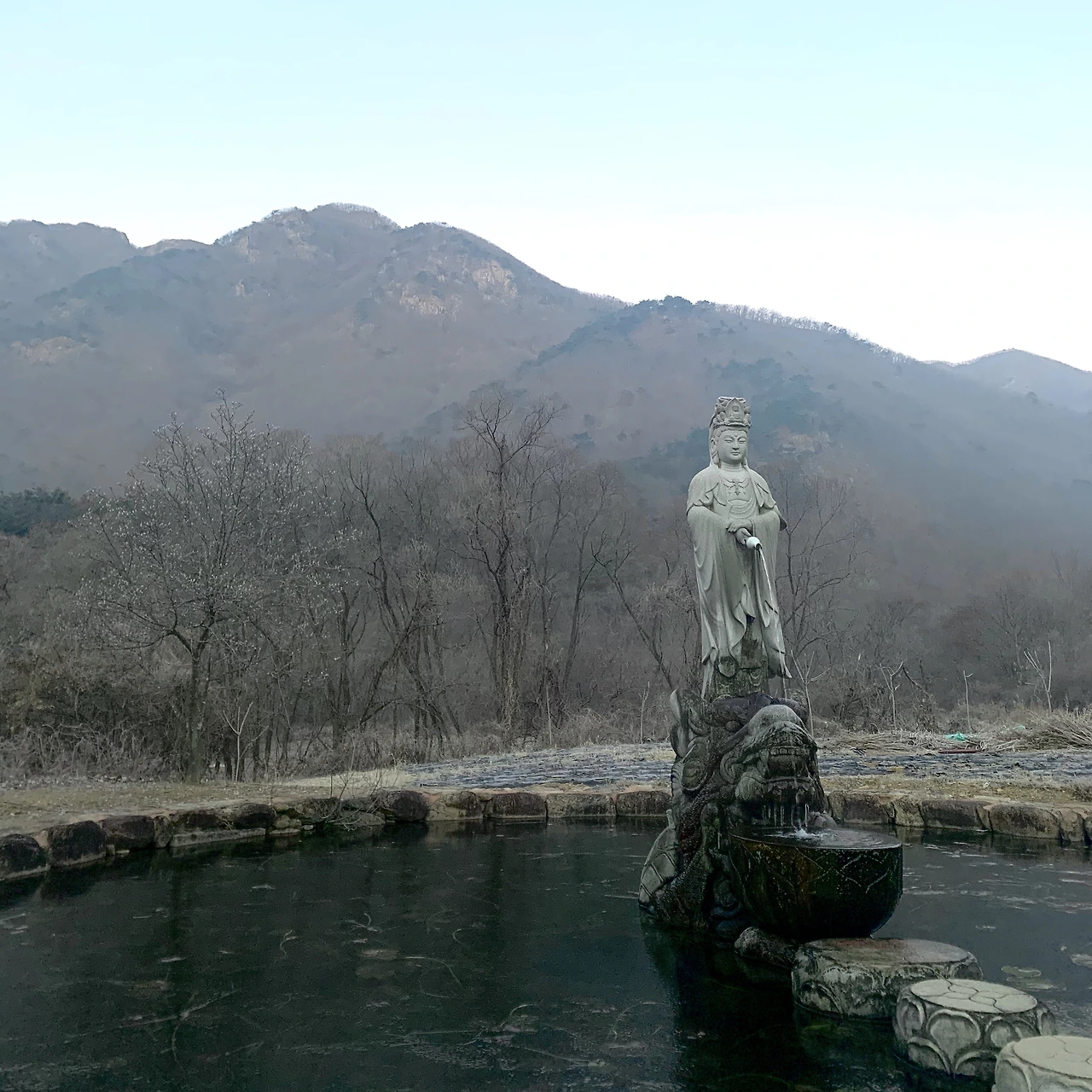 관음상은 대나무 숲과 편백나무 숲 사이에 있었다. 물이 졸졸 흘러나오는 물병을 들고 인자한 표정을 짓고 있다. 관음상 주변엔 작은 연못이 둘러져 있는데 날씨가 추워서 그런지 물이 꽁꽁 얼어있었다. 그런데 물병에 있는 물은 얼지 않고 계속 흐르고 있다. 흐르지 않는 것은 결국 멈추고 마는구나. 나도 흘러야지. 어떻게든 계속 흘러가야지 싶었다.