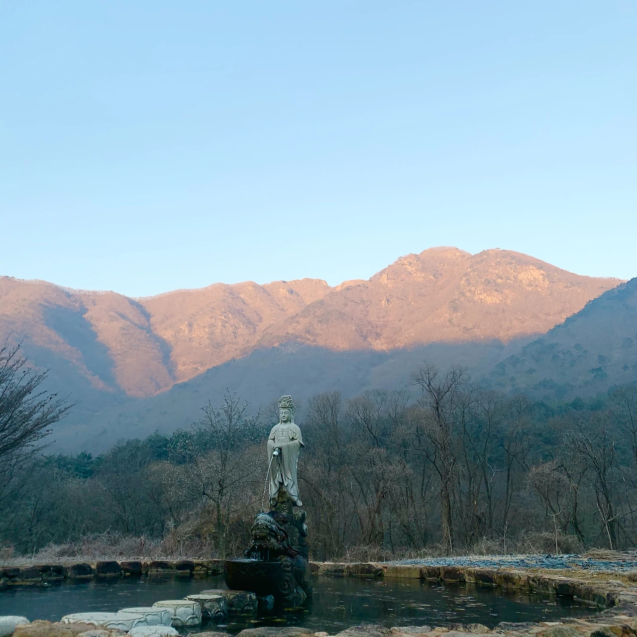 전망대에서 시간을 보내다가 내려오는데 문득 본 산등성이가 아침 햇살에 빨갛게 물들어있는 게 보였다. 자세히 보고 싶었는데 편백나무에 가려서 잘 안보였다. 그래서 관음상이 있는 곳까지 뛰어갔다. 아침에 108배를 해놓고 내리막길을 뛰어가다니 제정신일까… 중간에 넘어질 뻔했지만 그럴 가치가 있을 만큼 아름다웠다. 자연은 시시각각 모습이 달라져서 모든 순간을 기적처럼 만드는 것 같다. 붉게 물든 산을 보고 있으니 기적을 목격한 사람처럼 웃게 됐다.