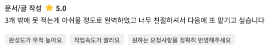 어제도 방대한 양의 작업을 반나절 안에 끝내도록 요청하곤, 견적으로 제시한 3만 원에 불만을 쏟아내는 고객을 만났다. 이럴 땐 술 한 잔 하면서 다른 고객의 정성스러운 리뷰를 본다... 그리곤 나는 절대 시급 5천 원짜리 인간이 아니라고 주문을 걸듯 되뇐다.