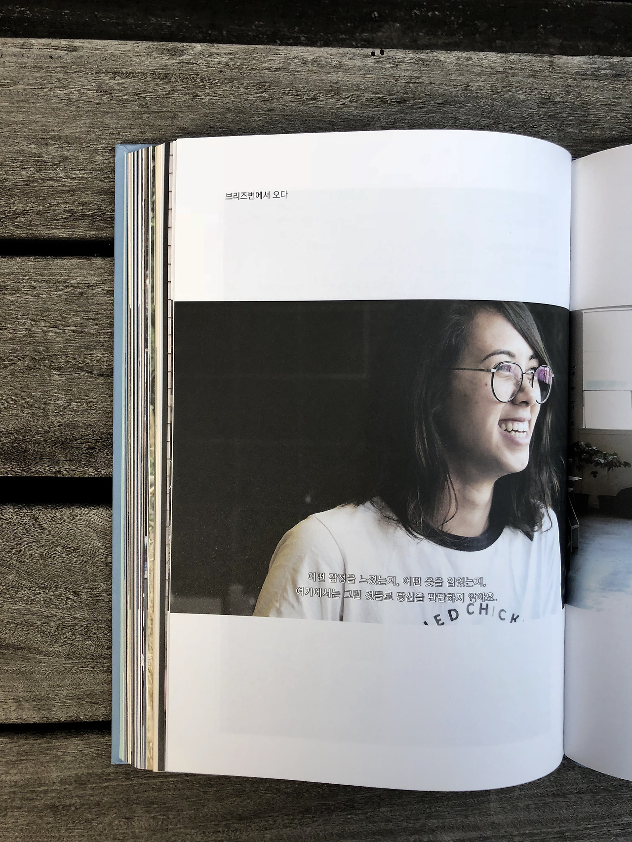 소설과 소설 사이에는 멜버른 사람들의 삶이 담겨있다. 브랜드 매니저, 큐레이터, 조각가, 바리스타, 푸드 라이터까지 하는 일은 모두 다르지만, 그들 모두 자신의 삶을 소중히 여기는 태도가 글에서 뚝뚝 묻어났다. 글에서도 사진에서도. 여기서도 디테일이 살아났는데, 인터뷰이 사진이 영화의 한 장면처럼 자막을 삽입했다. 이런 아날로그 감성은 다른 페이지에도 스며들어있다. 너무 많아서 다 말하지도 못하겠다.