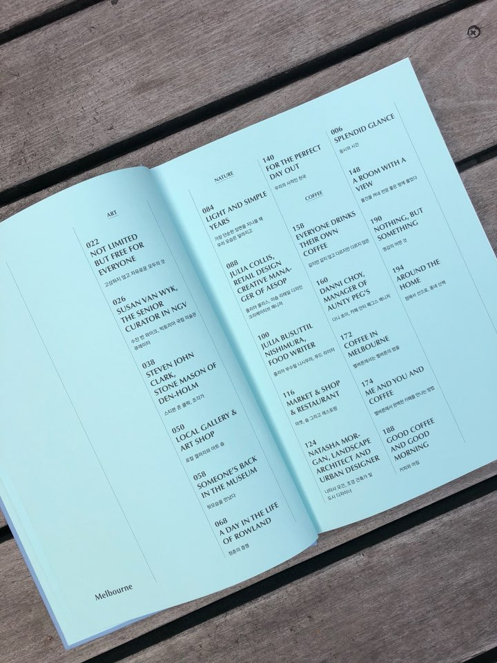 멜버른에 다녀온 지 한참 뒤에야 작은 동네책방, 땡스북스에서 그 매거진을 재회했다. 내가 기억하는 멜버른이 여기에는 어떻게 담겨있을지, 어떤 교집합을 발견하게 될지 궁금해 그제야 구매했다. 내리쬐는 햇살, 잔디에 누워 한낮의 여유를 맛보는 사람들, 생활이 예술인 도시 멜버른을 한 권의 잡지로 만나는 일은 또 다른 여행 같아 구석구석 살폈다. 책은 또 어찌나 조심스레 보게 되는지 아직도 남의 책 인양 하나하나 아껴보는 마음으로 읽게 된다.