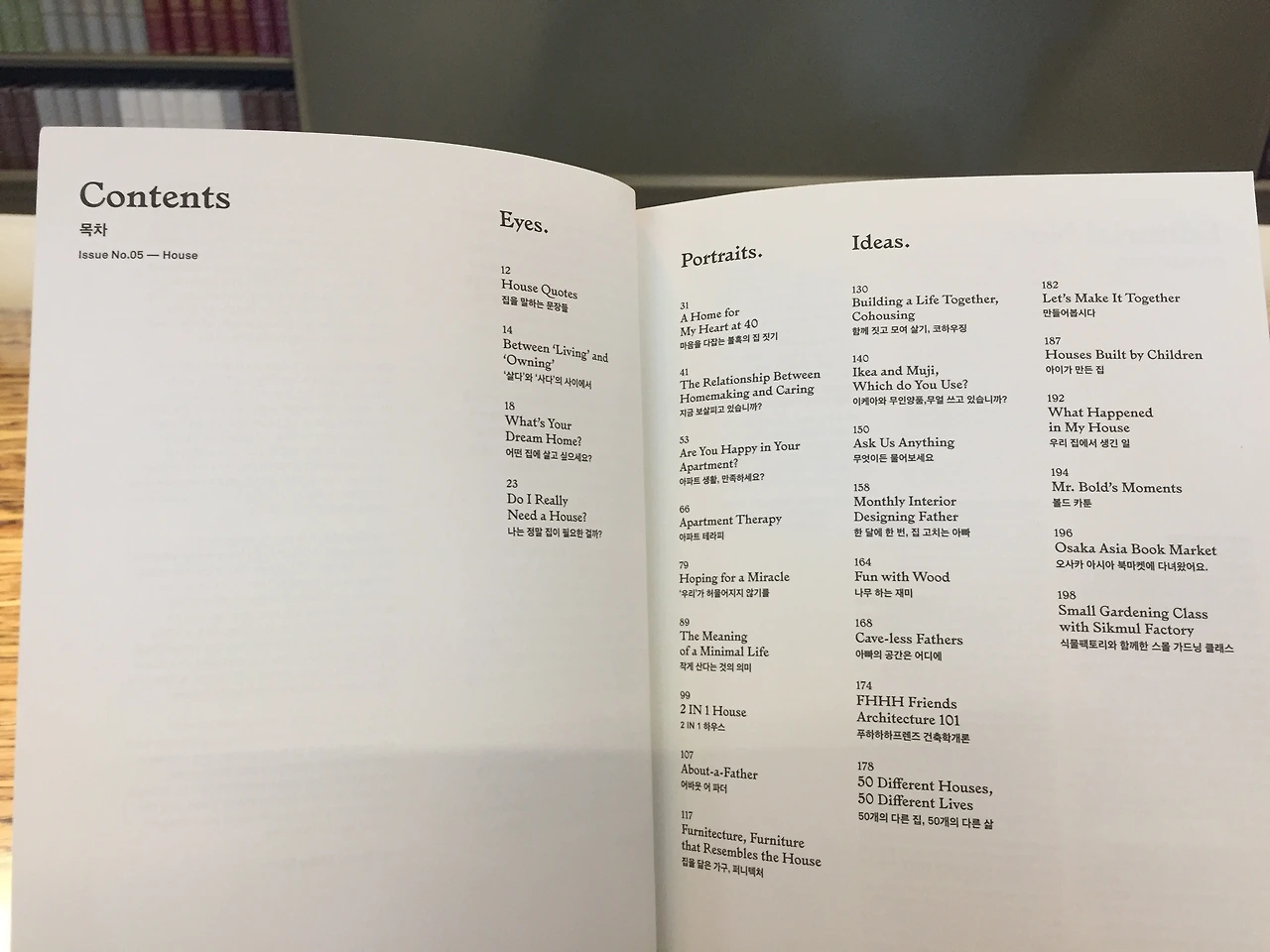정감이 가니, 목차도 달리 보인다. 다른 잡지는 주제가 통일되지 않아 내용과 깊이가 들쑥날쑥인데, 볼드 저널은 주제가 하나라, 시야가 얕았다가 점차 깊어진다. Eyes, Portraits, Ideas라고 목차 부제를 달아놓은 것도 재밌다. 처음에는 가벼운 이야기로 시작하다 어떻게 생각하는지 넌지시 물어보더니(Eyes), 다양한 양상의 집과 사람의 이야기를 들려주고(Portraits), 내 상황에 맞게 고려할 수 있는 다양한 선택지와 귀여운 에피소드를 소개한다(Ideas). 내게 맞는 집을 테스트할 수 있는 시험지도 있었다.(생각보다 어려워서 풀다 보류했다.) 이쯤 되니 다른 이슈도 궁금해졌다. 상상력이 부족한 터라 어떤 이야기로 콘텐츠를 풀 수 있을지 가늠이 되지 않았는데, 생각보다 의외의 주제들이 많았다. 예를 들면 Puberty(아빠의 사춘기), Lifelog(일상의 작은 기록), Gender(아빠의 젠더 감수성) 같은 이슈들. 사람과 삶을 오래 고민하지 않으면, 나오지 않을 법한 주제라 더 들춰보고 싶게 만들었다. 조만간 서점에 들러야겠다.
