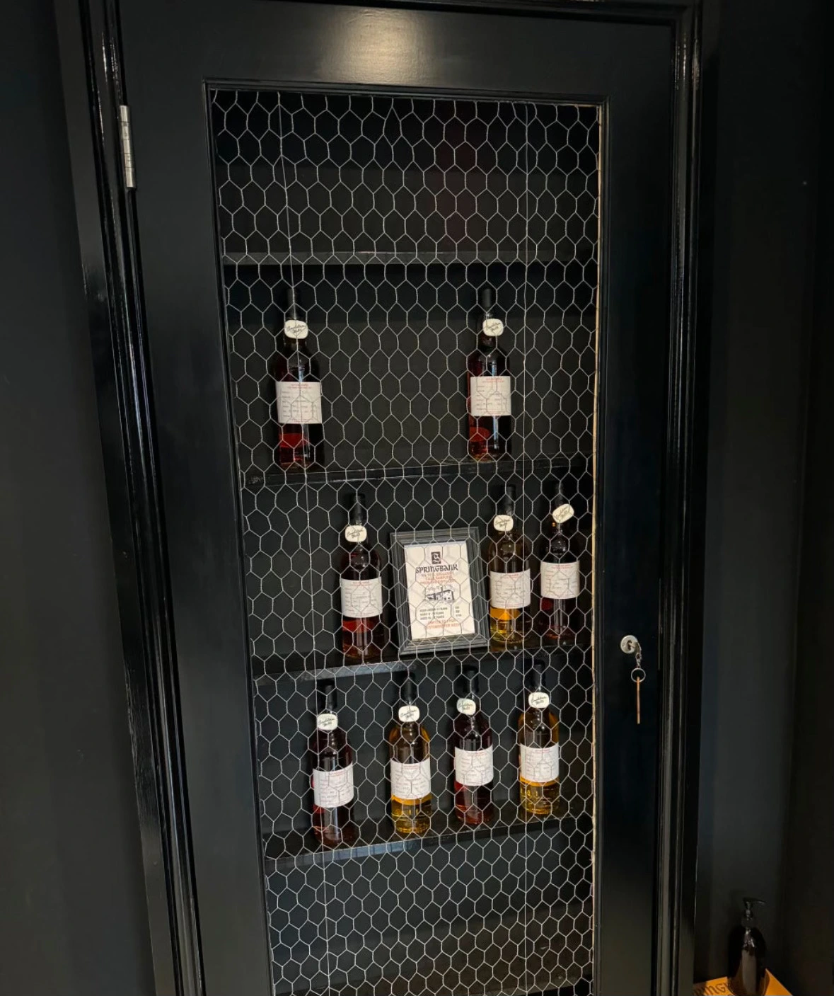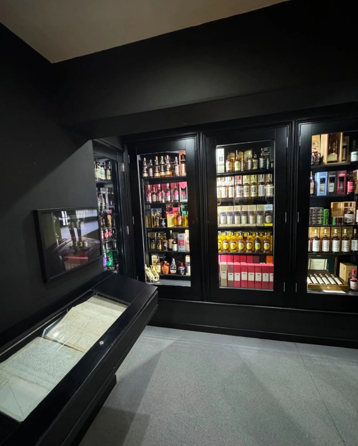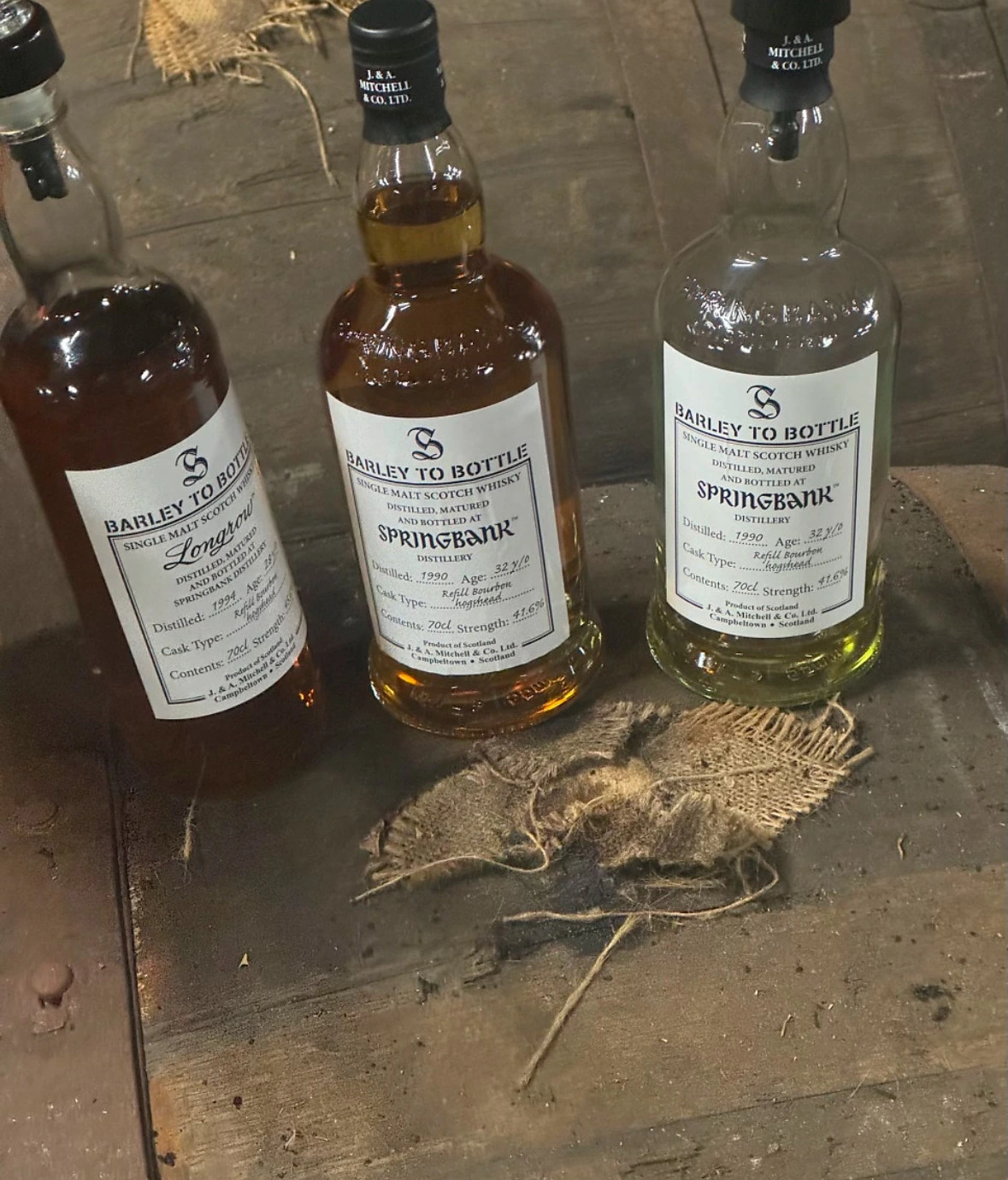 (좌) 스프링뱅크 증류소의 케이지 바틀. CS이며 주마다 한정 수량을 인당 한병씩만 판다. (우) 스프링뱅크의 역대 제품들 전시