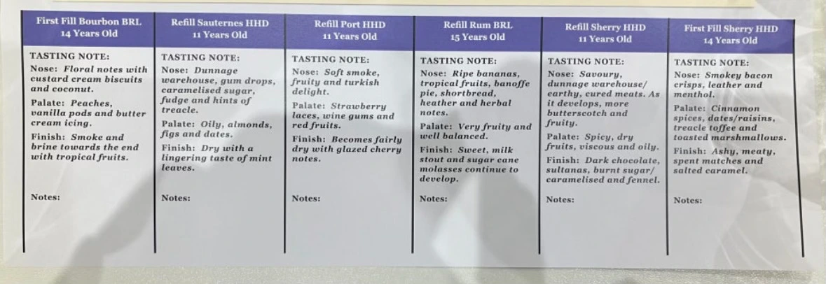 Barley to Bottle 체험. (우) 각 위스키의 테이스팅 노트