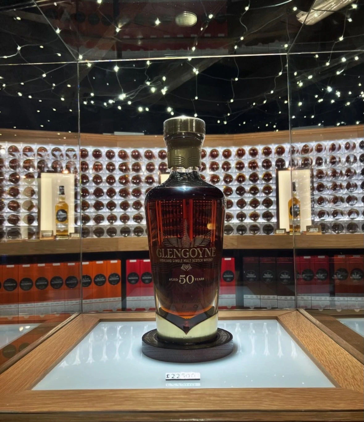 글렌고인 방문객 센터에 전시된 글렌고인 50년. 마치 왕처럼 뒤로 글렌고인 제품을 거느리고 있다. 가격 22500 파운드 (한화 약 4000만원)