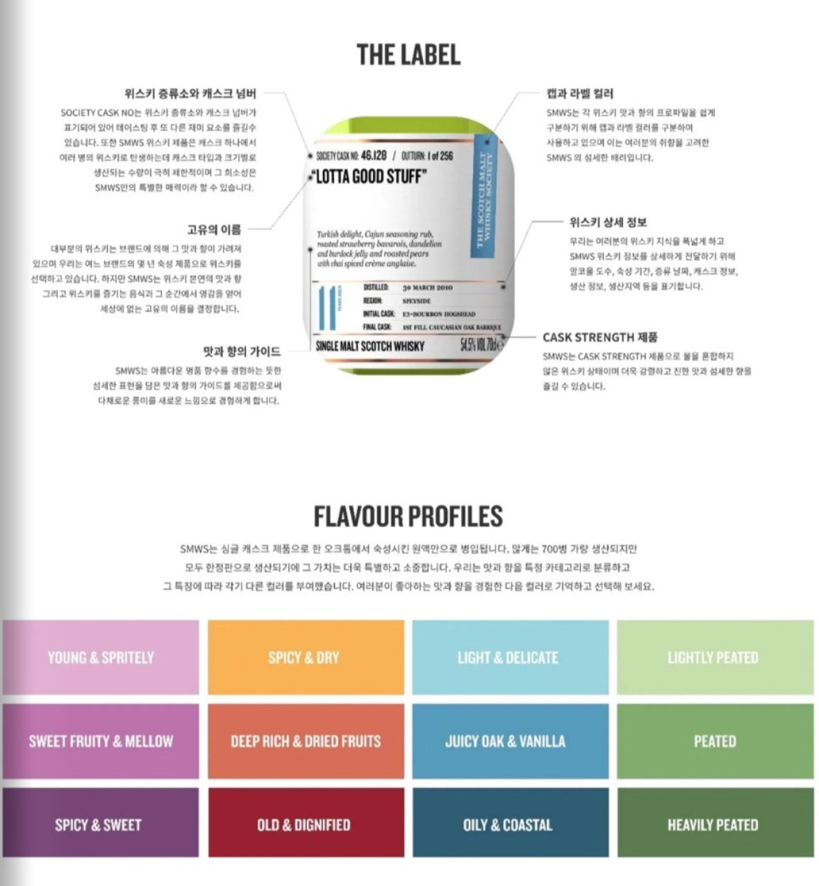 SMWS는 소비자들에게 더 직관적인 선택을 돕기 위해 위스키를 12가지 풍미 프로필로 분류합니다. 라벨에는 테이스팅 패널의 평가를 반영한 독창적인 이름이 부여됩니다. 이는 단순히 향미를 설명하는 데 그치지 않고, 위스키가 주는 감각적 경험을 비유적으로 표현하는 방식으로 각 병마다 특별한 이야기를 전달합니다.