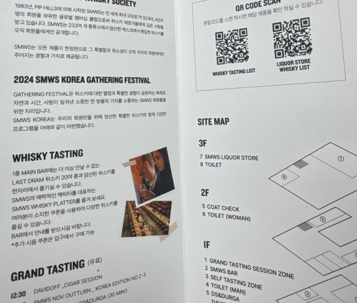2024 SMWS Korea Gathering Festival은 단순히 위스키를 마시는 것을 넘어 SMWS의 독창적인 철학과 감각적 경험을 탐험할 수 있는 시간이었습니다. 앞으로도 이러한 행사가 지속적으로 열리기를 기대하며, 위스키 애호가들에게 강력히 추천합니다. SMWS의 CS 제품은 그 자체로 위스키 세계의 새로운 지평을 열어주는 특별한 선택임을 다시 한 번 느낄 수 있었습니다.