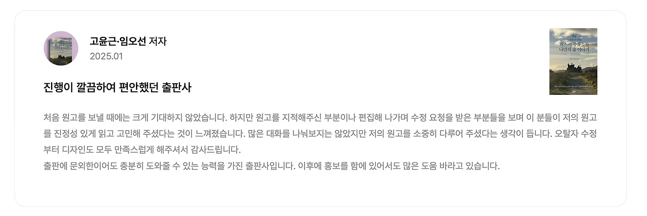 좋은땅 출판사는 진행 과정이 깔끔하고 체계적이어서, 처음 출판을 준비하는 저도 전혀 부담 없이 진행할 수 있었습니다. 소통 과정도 친절하고 명확했으며, 원고 작업 외에도 북토크나 홍보 관련 부분에서도 지속적으로 도움을 주실 것이라는 기대가 들었습니다.