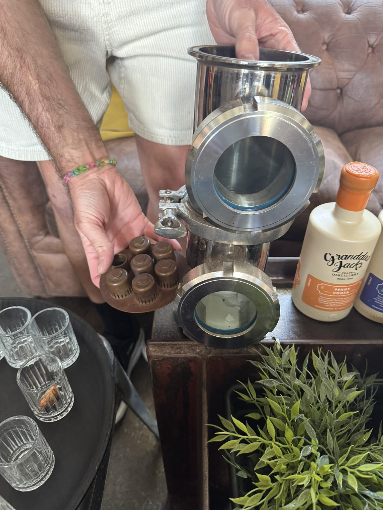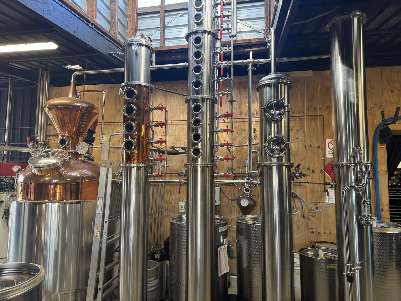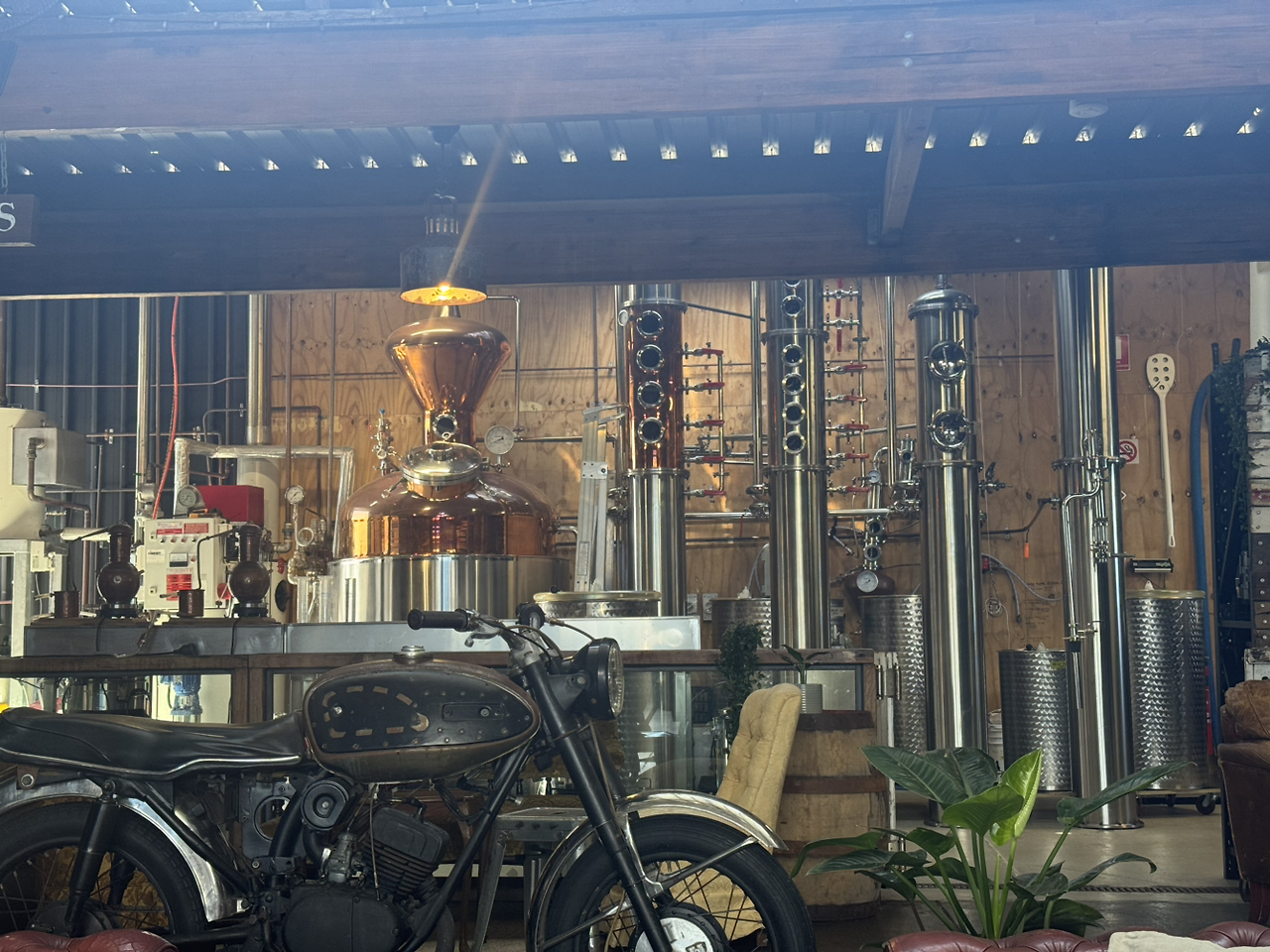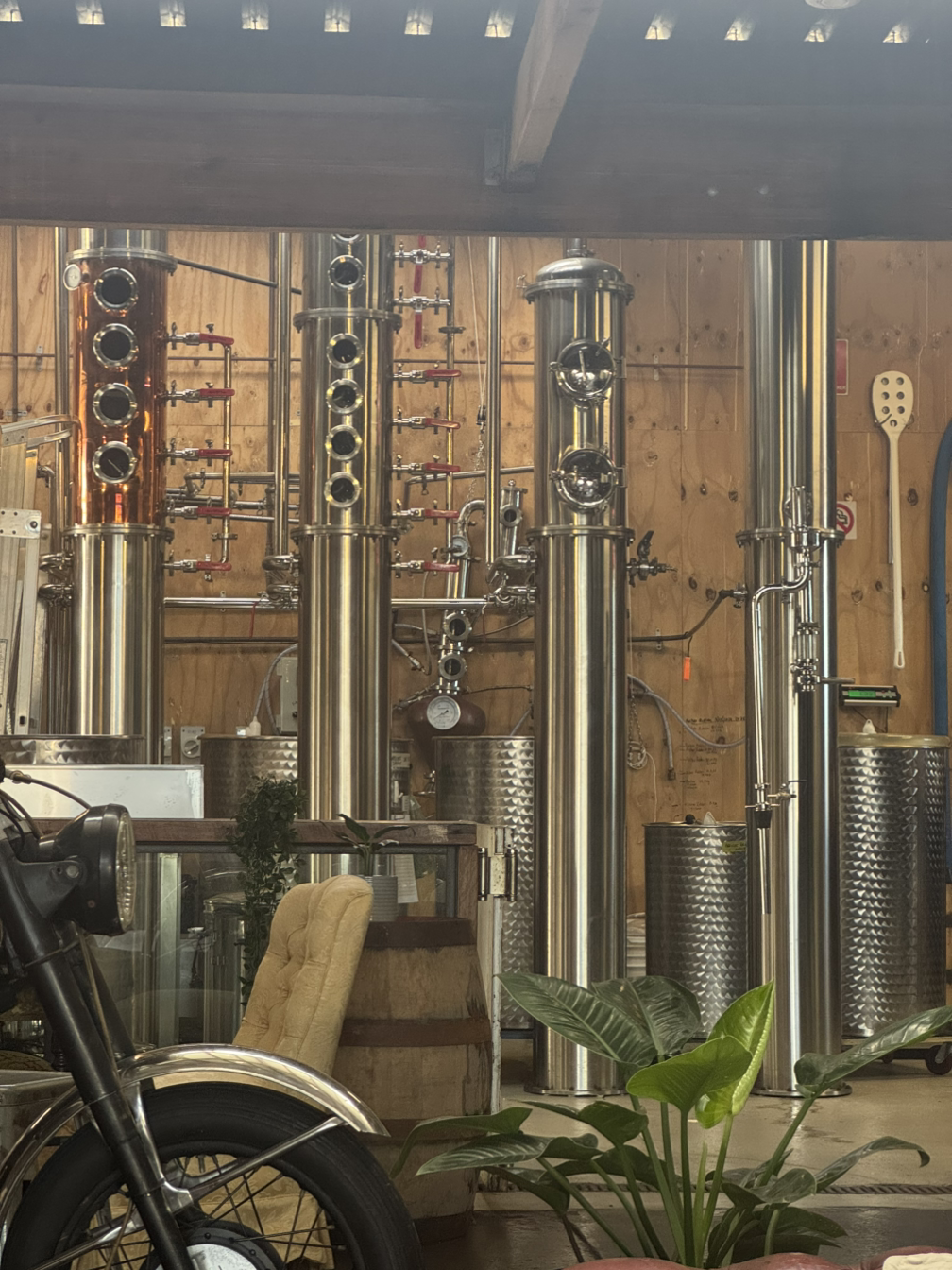2025년 5월에 방문한 호주 퀸즐랜드 골드코스트의 Granddad Jack’s(그랜드대드 잭스) 증류소 내부 : 단식 증류기와 연속식 증류기가 나란히 서 있다. 작은 크래프트 증류소의 창고형 공간에 햇빛이 쏟아지는 장면이 인상적이다.
