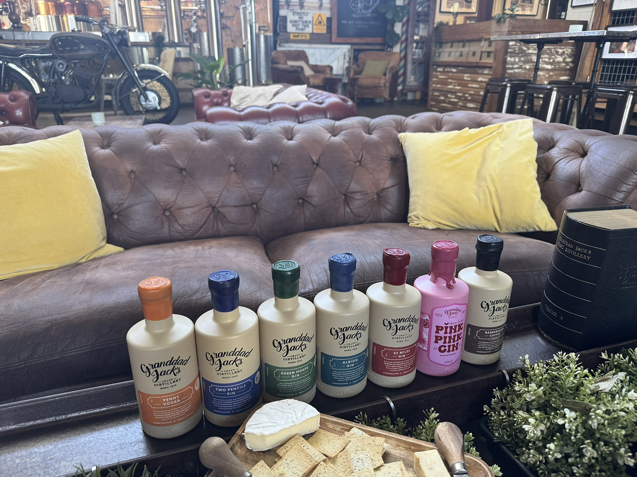 증류소 테이스팅 룸의 편안한 소파 위에 진열된 Granddad Jack’s의 보드카, 진 그리고 커피 리큐르. 현장에서 현지 치즈와 크래커를 곁들여 다양한 시음을 즐길 수 있다.