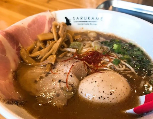 사루카메는 원숭이(サル)와 거북이(カメ)의 합성어로 이름만 들어선 라멘가게를 연상하기 어렵다. 인테리어 역시 일본색을 모두 없애 제 발로 들어오기 전에는 이 집이 라멘가게인지 긴가민가할 것이다. 가게 입구에 영업중임을 표시하는 노렌으로 원숭이 조각상이 걸려 있고, 가게 BGM으로 원숭이섬의 비밀 OST가 흐른다. 온전히 자신의 취향으로 꾸민 것인데, 왜 인지는 알 수 없지만 개그맨 유세윤에 영감을 받았다고 한다. 원피스에서 영감받은 줄 알았는데