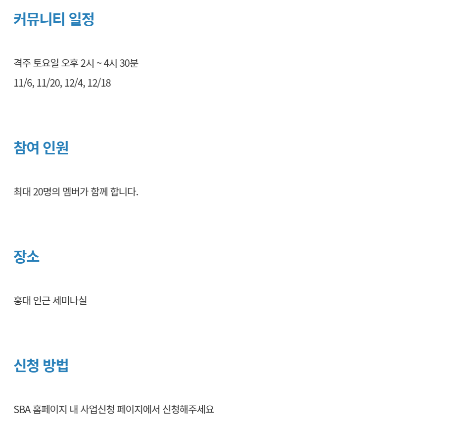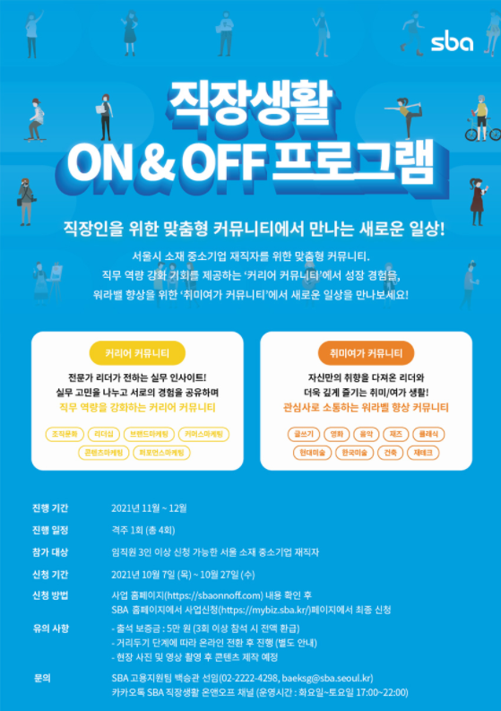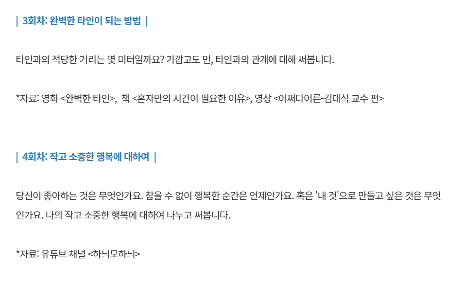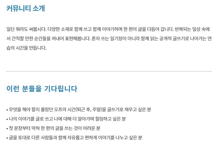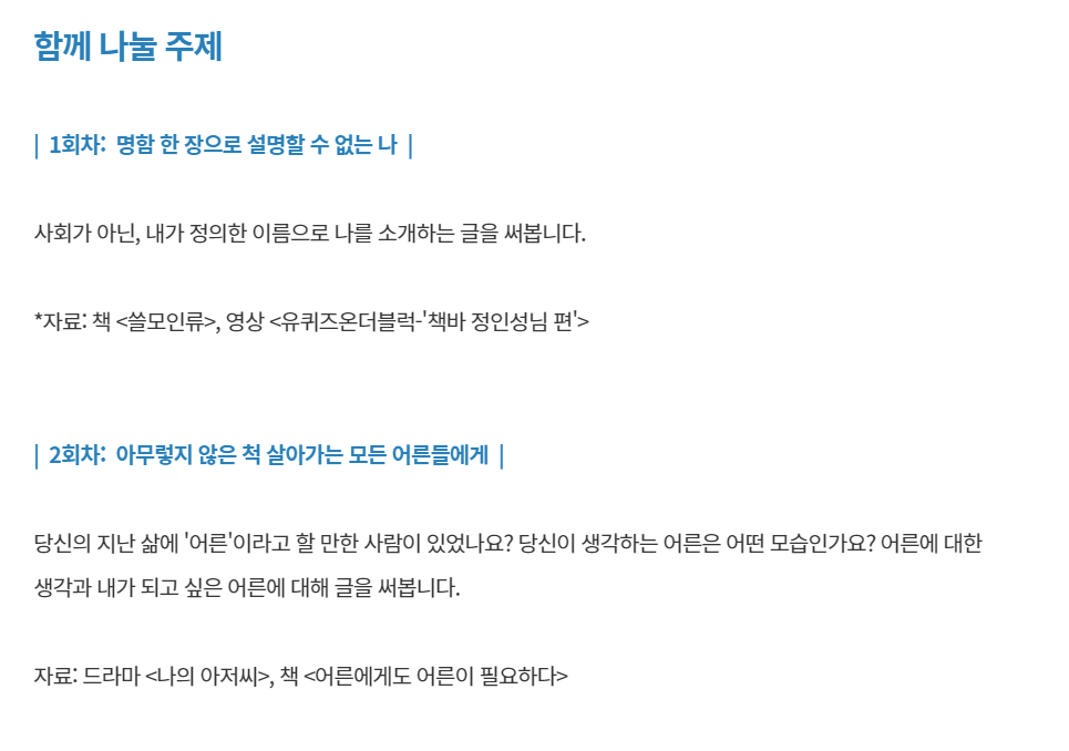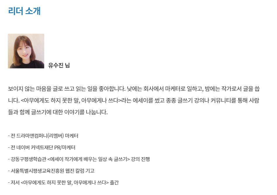 다시 글쓰기 모임을 갖고 싶다고 생각하던 찰나에, 좋은 기회로 서울산업진흥원(sba)과 함께 <직장생활 ON&OFF 프로그램>중 하나인 글쓰기 모임 '함께 읽는 글쓰기'를 진행하게 되었습니다. 3인 이상 임직원이 신청 가능한 서울 소재 중소기업 재직자 대상입니다. 저처럼 글쓰기 모임이 그리우셨던 분, 혹은 한 번도 글쓰기 모임을 해본 적은 없지만 더 이상 미룰 수 없을 것 같은 분들이시라면 꼭 한 번 참여해보세요. 특히 직장생활 OFF의 시간을 어떻게 보내야 할지 고민이셨다면, 우리 올해가 가기 전에 같이 글 쓰고 살아가는 이야기 해요. 어느새 자신만의 이야기를 에세이로 풀어낼 여러분을 발견하실 수 있을 거예요.