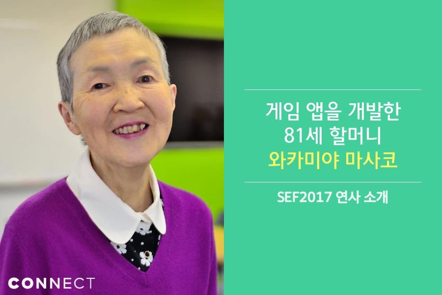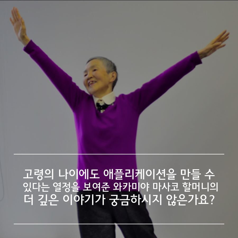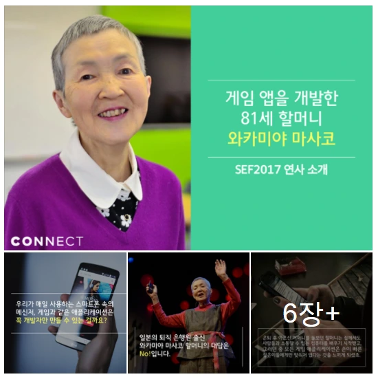 부끄럽지만 내가 만든 카드뉴스 중 하나로, SEF(Software Edu Fest)2017을 홍보하기 위해 만든 카드뉴스다. 무려 81세라는 고령의 나이에 게임 애플리케이션을 개발한 와카미야 마사코 할머니가 연사로 참여하시게 되었지만, 와카미야 마사코 할머니가 어떤 할머니인지 아는 사람은 많지 않았다. SEF2017은 소프트웨어에 관심있는 누구나 참여할 수 있는 컨퍼런스였기 때문에, 어린 학생들도 쉽게 이해할 수 있고 나이가 많은 분들도 소프트웨어에 관심만 있다면 도전할 수 있다는 것을 와카미야 마사코 할머니의 이야기로 담아내고 싶었다.