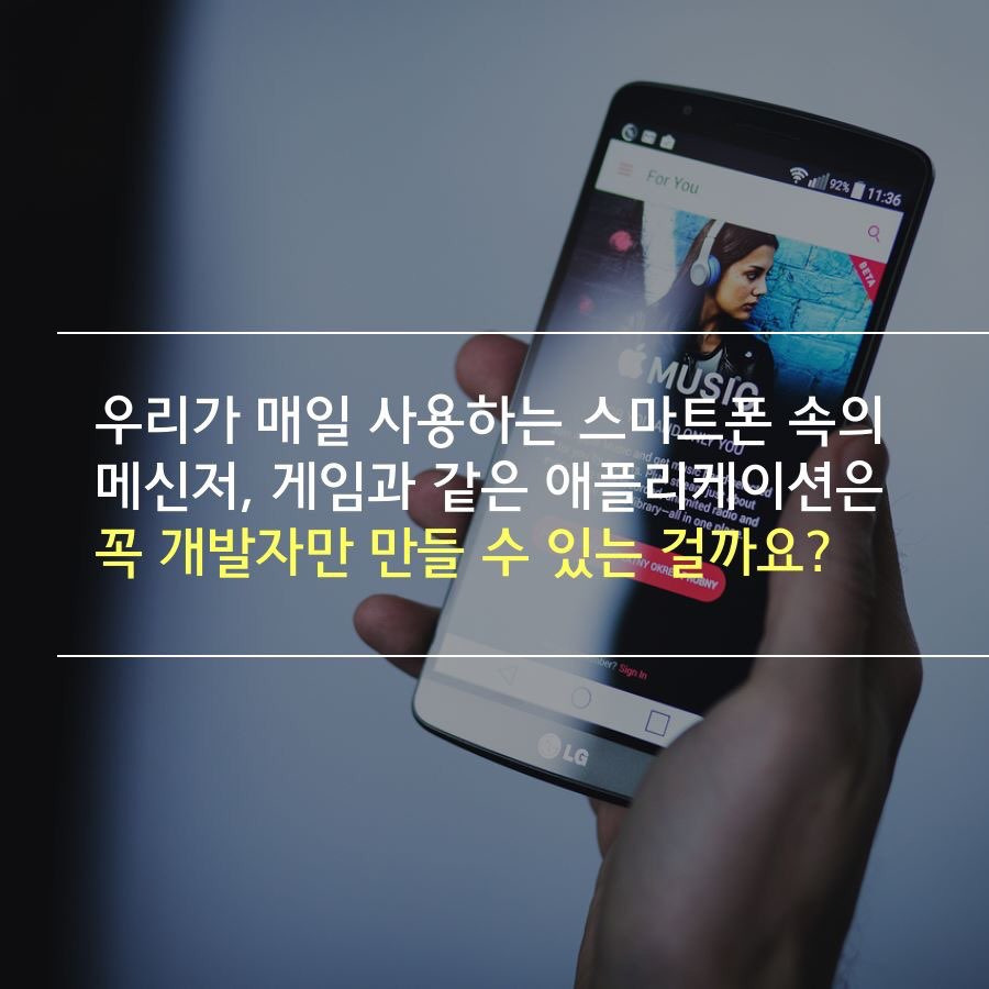 이어서 두 번째 장에는 질문을 던졌다. "우리가 매일 사용하는 스마트폰 속의 메신저, 게임과 같은 애플리케이션은 꼭 개발자만 만들 수 있는 걸까요?" 라고. 사실 대부분의 사람들이 '그렇다'라고 생각한다. 나 역시 몇 년전까지만 해도 당연히 그렇다고 생각했다. 하지만,