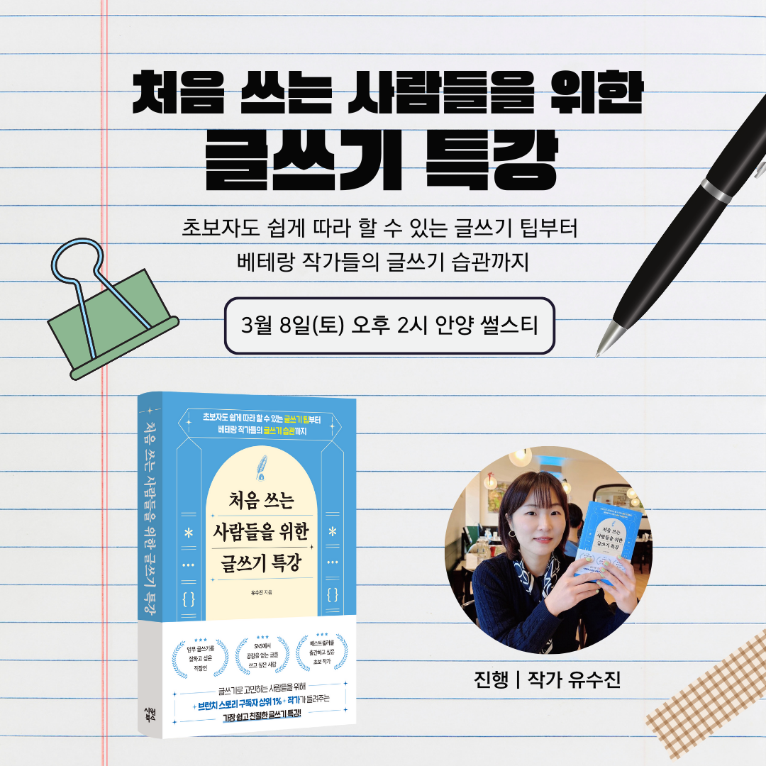 책 <처음 쓰는 사람들을 위한 글쓰기 특강>을 기반으로 구성된 강의이자 북토크입니다. 책을 미리 참고하셔도 좋지만 필수는 아닙니다.